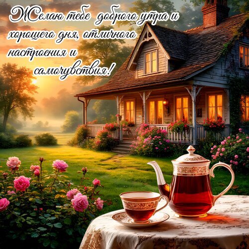 Уютная и вдохновляющая картинка для доброго утра. На изображении запечатлен живописный загородный дом в лучах восходящего солнца, цветущий сад с розовыми розами и сервированный стол на террасе с чайником и чашкой ароматного чая. На картинке присутствует надпись на русском языке: «Желаю тебе доброго утра и хорошего дня, отличного настроения и самочувствия!». Идеально подходит для отправки в мессенджерах, соцсетях и для пожеланий хорошего настроения близким людям.