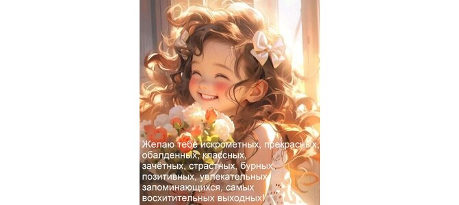 Теги:желаю тебе искрометных, прекрасных, обалденных, классных, зачётных, страстных, бурных, позитивных, увлекательных, запоминающихся, самых восхитительных выходных