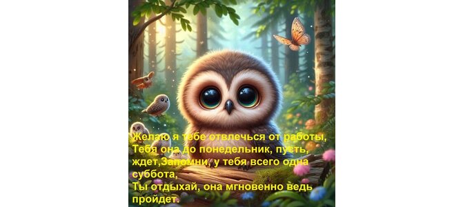 Теги:желаю я тебе отвлечься от работы, тебя она до понедельник, пусть, ждет, запомни, у тебя всего одна суббота, ты отдыхай, она мгновенно ведь пройдет