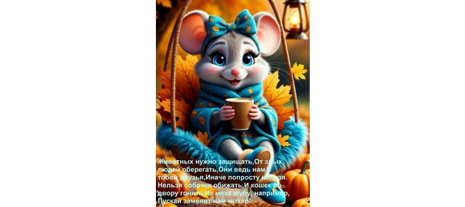 Теги:животных нужно защищать, от злых людей оберегать, они ведь нам с тобой друзья, иначе попросту нельзя нельзя собачек обижать, и кошек по двору гонять, из меха шубу, например, пускай заменит нам мохер