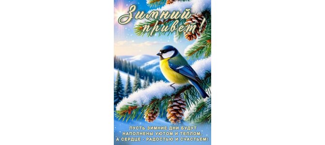 Открытка "ЗИМНИЙ ПРИВЕТ! ПУСТЬ ЗИМНИЕ ДНИ БУДУТ НАПОЛНЕНЫ УЮТОМ И ТЕПЛОМ, А СЕРДЦЕ - РАДОСТЬЮ И СЧАСТЬЕМ!"