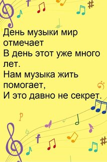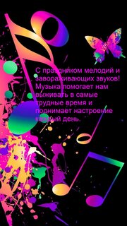 Музыка всегда присутствует в жизни человека. Она бодрит и поднимает настроение, либо наоборот успокаивает и помогает заснуть. Очень впечатлительных особ музыка может даже заставить заплакать, тронут глубинные струны души. Но вот уж точно музыка никого не оставит равнодушным и у каждого есть его любимый исполнитель, певец или песня. С днем музыки друзья.