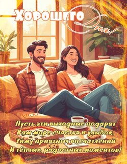 Открытки с пожеланиями хороших, классных, отличных выходных. Разнообразные пожелания провести отлично выходные. Смешные, забавные, милые, красивые, романтичные, шикарные открытки. На любой вкус цвет, пол и возраст. Открытки в стихах и прозе, на любое время года и период месяца. Вообщем огромная коллекция открыток для выходных дней.
