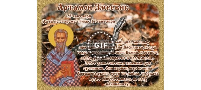 Артамон Змеевик. 25 сентября. Дата по старому стилю: 12 сентября. На Руси отмечали два змеинных праздника: весной, на Василиска, когда гады выползали на свет Божий, и осенью, когда уходили обратно в подземелье. Этот день считался важным для охотников. Они верили, что если на Артамона убить хотя бы зайца, то удача будет сопутствовать во всех начинаниях.