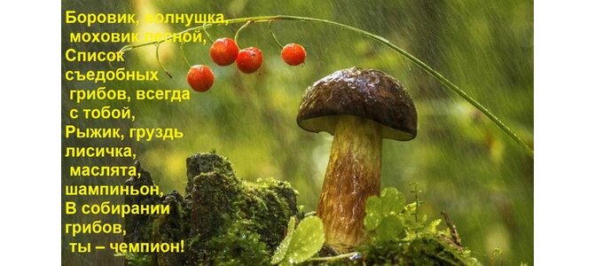 Открытка "Боровик, волнушка, моховик лесной, Список съедобных грибов, всегда с тобой, Рыжик, груздь лисичка, м"
