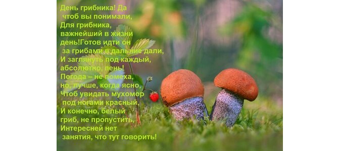 Теги:день грибника да чтоб вы понимали, для грибника, важнейший в жизни день готов идти он за грибами в дальние дали, и заглянуть под каждый, абсолютно, пень погода не помеха, лучше, когда ясно, чтоб увидать мухомор под ногами красный, и конечно, белый гриб, не пропустить, интересней нет занятия