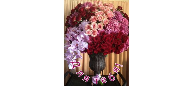 Вт вазе на столике стоит огромный букет. Подпись на открытке "Для тебя!"