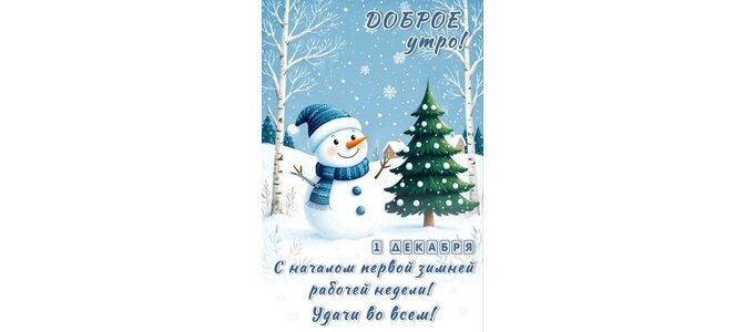 Открытка "ДОБРОЕ УТРО! 1 ДЕКАБРЯ. С НАЧАЛОМ ПЕРВОЙ ЗИМНЕЙ РАБОЧЕЙ НЕДЕЛИ! УДАЧИ ВО ВСЕМ!"