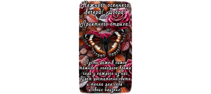 Теги:добрый вечер, вечер, бабочка, осень, поздняя осень, цветы, розы, пожелание на каждый день, про любовь