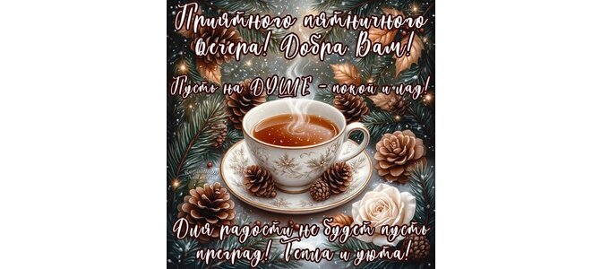 Теги:добрый вечер, вечер, снег, чай, чашка чая, осень, зима, поздняя осень, пожелания на каждый день, розы, цветы, шишки, про радость