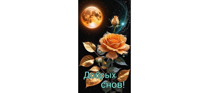 На фоне ночного неба и Луны красивая веточка розы. Подпись на открытке " Добрых снов!"