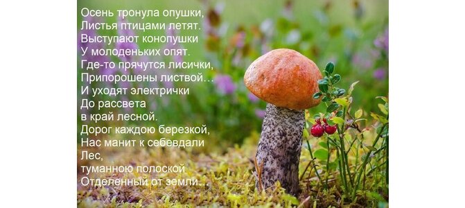 Теги:осень тронула опушки, листья птицами летят выступают конопушки у молоденьких опят где-то прячутся лисички, припорошены листвой и уходят электрички до рассвета в край лесной дорог каждою березкой, нас манит к себевдали лес, туманною полоской отделенный от земли