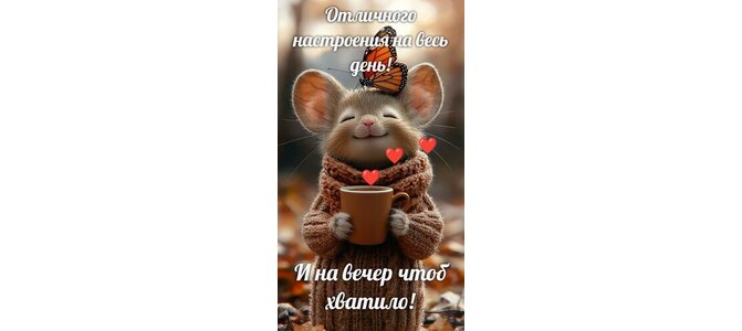 Мультяшный мышонок улыбается, держит в руках чашку с кофе, а на голове у него сидит бабочка." Отличного настроения на весь день! И на вечер чтоб хватило!"