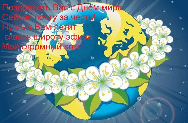 Открытка "Поздравить Вас с Днем мира Сейчас почту за честь! Пусть к Вам летит сквозь широту эфира Мой скромный"