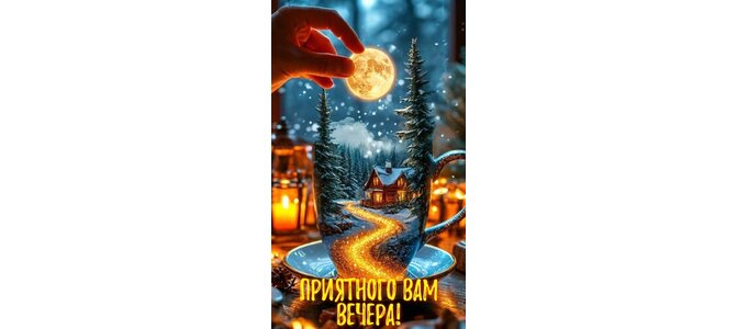 В стеклянном бокале просматривается светящаяся дорога, которая ведëт к маленькому дому, стоящему среди заснеженных елей. В небе светит круглая луна. Подпись на изображении "Приятного вам вечера!"