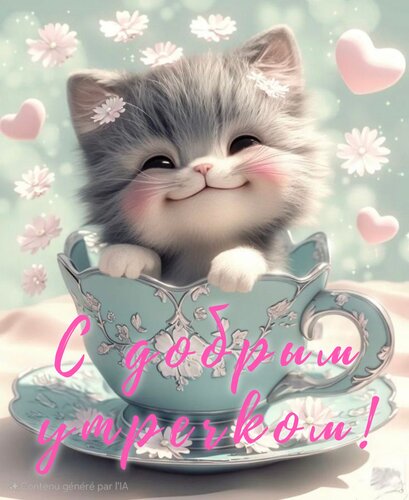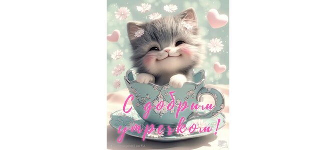 В красивой чашечке сидит мультяшный котëнок и улыбается