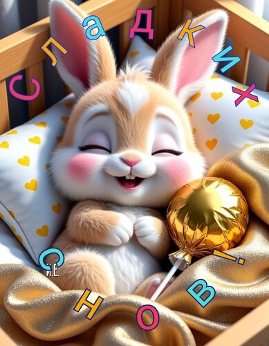 Вт кроватке сладко спит зайчик. Надпись на открытке "Сладких снов!"