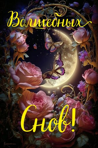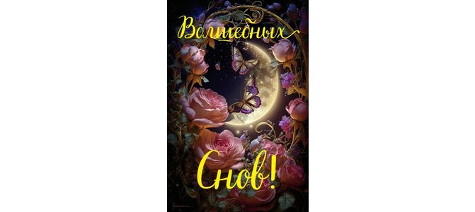 На звëздном небе огромный месяц в обрамлении прекрасных роз. Текст на открытке "Волшебных снов!"