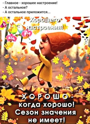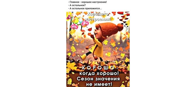 - Главное - хорошее настроение! - А остальное? - А остальное приложится... Хорошего. настроения! Хорошо- когда хорошо! Сезон значения не имеет!