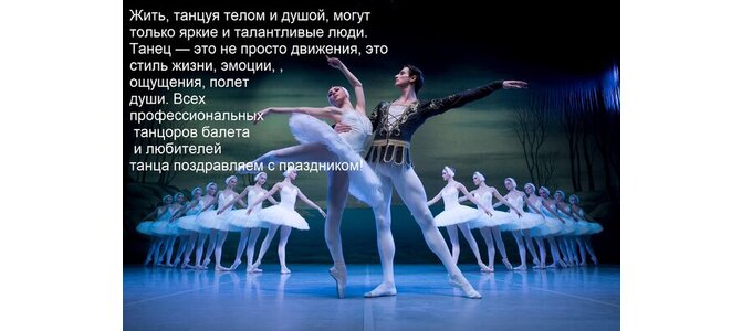 Теги:жить, танцуя телом и душой, могут только яркие и талантливые люди танец это не просто движения, это стиль жизни, эмоции, ощущения, полет души всех профессиональных танцоров балета и любителей танца поздравляем с праздником