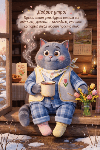 Анимированная открытка "Доброе утро! Пусть этот день будет таким же тёплым, мягким и ласковым, как кот, который тебя любит п"из раздела пожелания